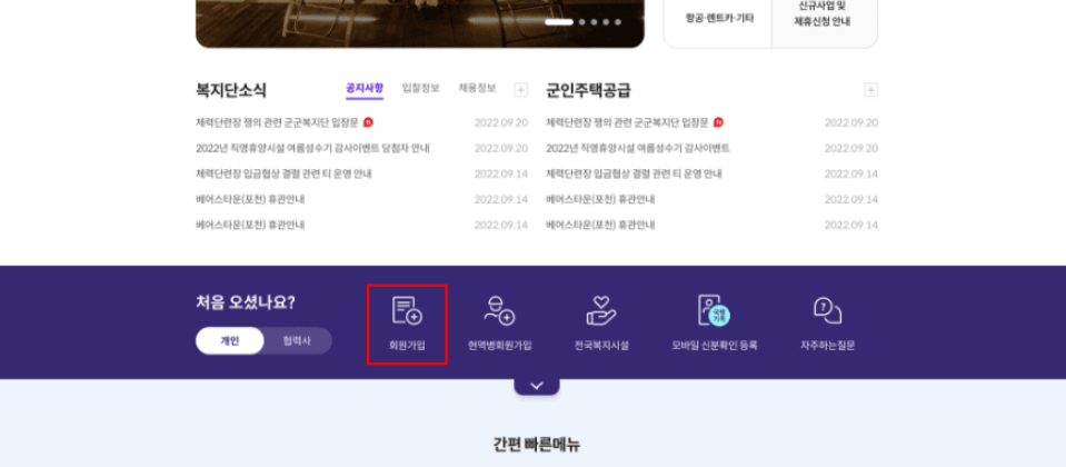 국군복지포털을 이용하기 위해서는 사이트 회원가입 및 인증을 받아야 합니다.