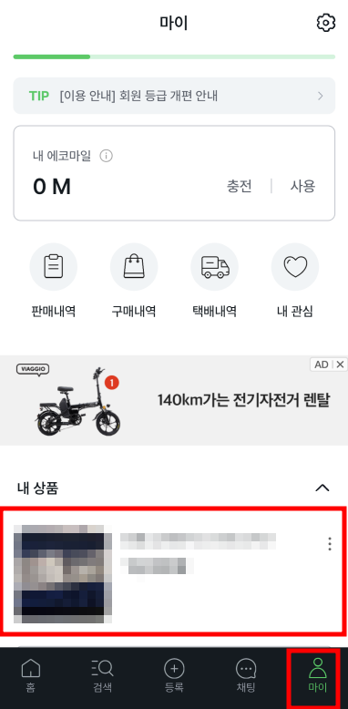 1. 상품을 등록하고 '하단 아래 - 마이'에 들어갑니다.